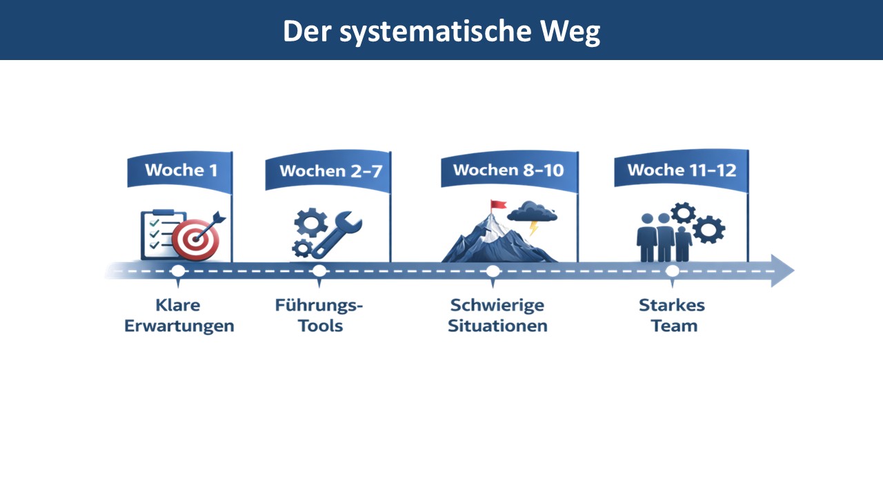 Jetzt lernt die Führungskraft das Handwerk. Nicht theoretisch. Sondern praktisch, Woche für Woche: