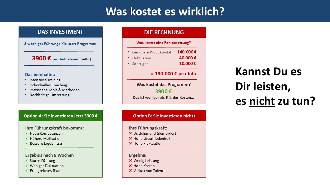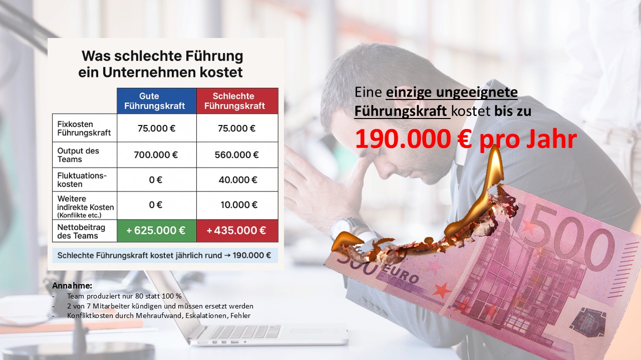 Die Führungskraft lernt durch Fehler. Durch Reibung. Durch Verlust. Vielleicht wird sie irgendwann gut. Vielleicht auch nicht. In der Zwischenzeit: 190.000 Euro pro Jahr. Frustrierte Mitarbeiter. Verpasste Chancen.