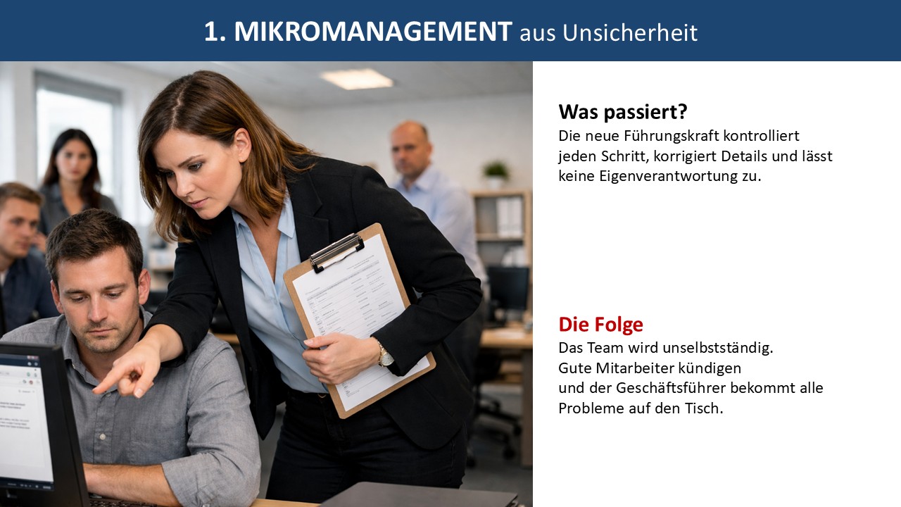Die Führungskraft kontrolliert jeden Schritt, korrigiert jedes Detail, lässt keine Eigenverantwortung zu. Warum? Weil sie sich nicht sicher ist, ob das Team liefert. Das Ergebnis: Das Team wird unselbstständig. Gute Leute kündigen. Und Sie als Geschäftsführer bekommen alle Probleme auf den Tisch.