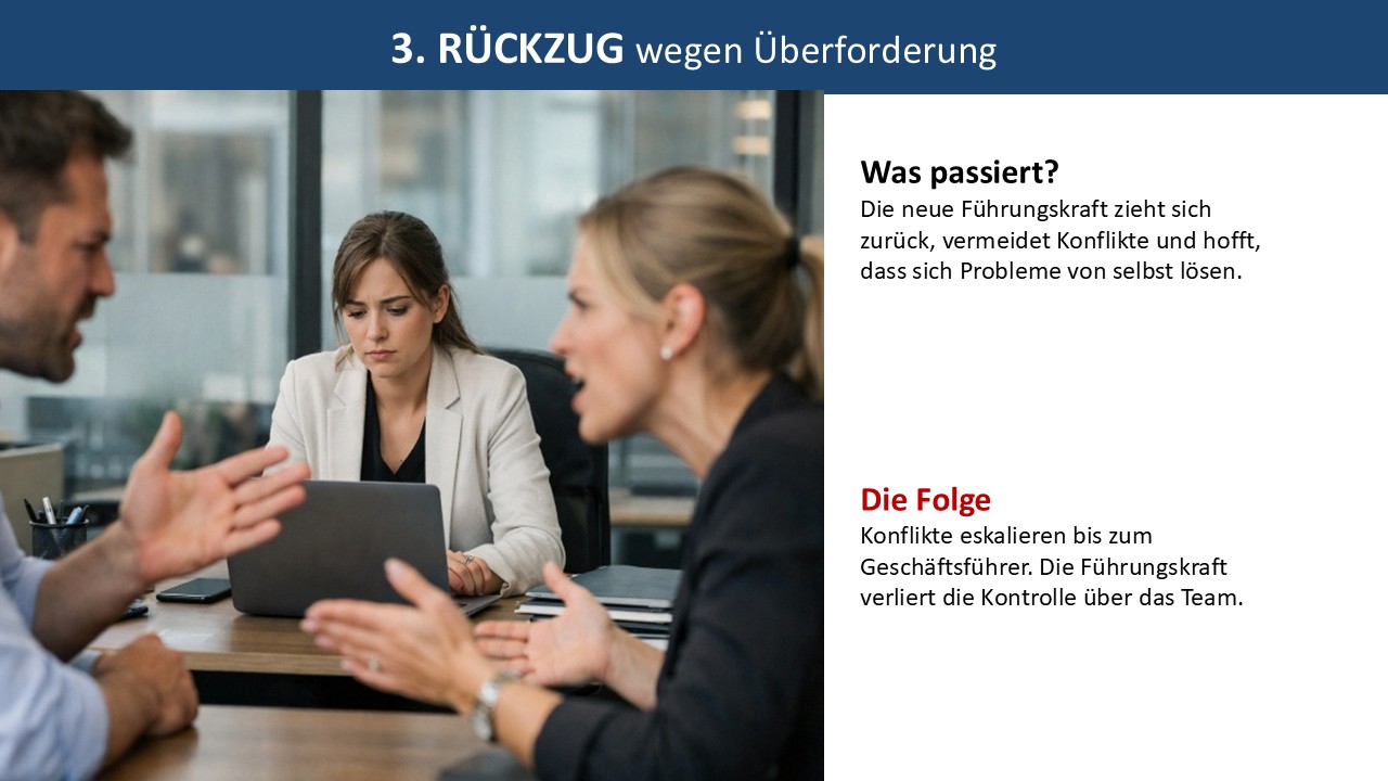 Die Führungskraft zieht sich zurück, vermeidet Konflikte, hofft, dass sich Probleme von selbst lösen. Das Ergebnis: Konflikte eskalieren. Die Kontrolle geht verloren. Und am Ende landen alle Probleme bei Ihnen.