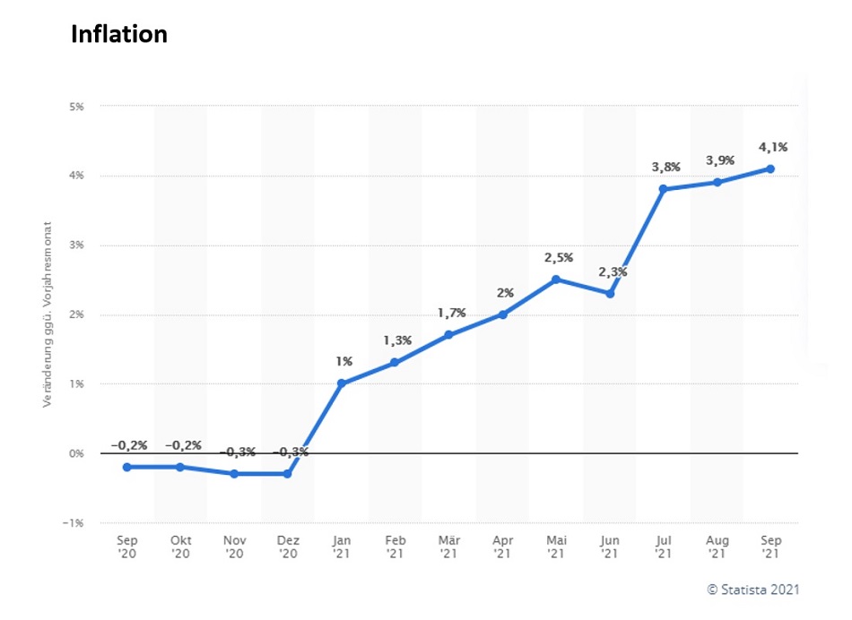 Die Inflationsrate in Deutschland ist im September 2021 bereits über 4 %. So hoch war die das letzte Mal vor 28 Jahren, also 1993.