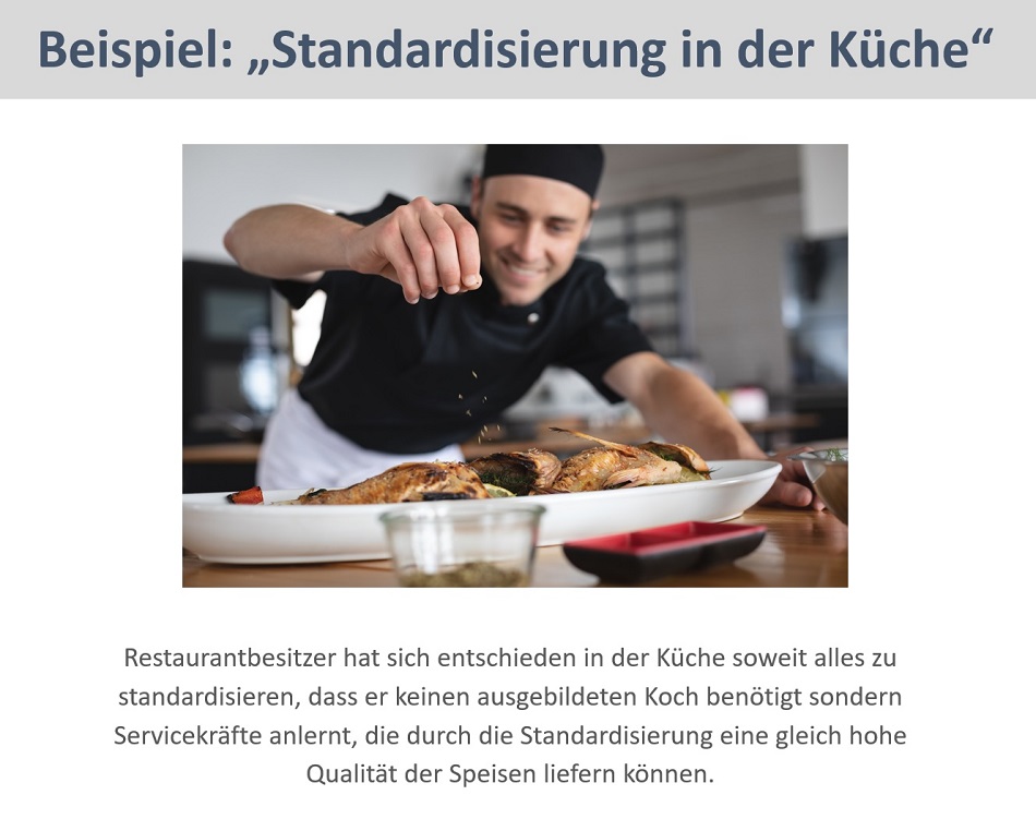 Er hat sich entschieden in der Küche soweit alles zu standardisieren, dass er keinen ausgebildeten Koch benötigt sondern Servicekräfte anlernt, die durch die Standardisierung eine gleich hohe Qualität der Speisen liefern können.
